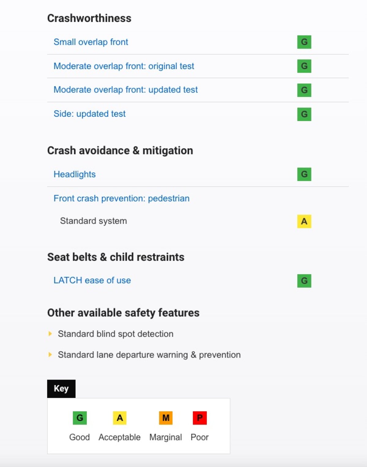 The criteria for earning a Top Safety Pick+ is challenging. It requires “Good” ratings in 2 of the tested categories – the small overlap front test and the updated side test. It also requires Acceptable or Good ratings in the updated moderate overlap front test, headlights standard, and pedestrian front crash prevention test. A “Good” rating is IIHS’ highest rating, with the ratings below it being, Acceptable, Marginal and Poor being the lowest rating.